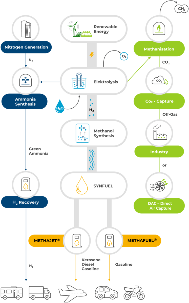Since 2008 we have been working successfully on the development and application of our own technologies for climate-neutral fuels on the basis of methanol. The advantage lies in the cost-effective production of methanol in regions with favorable energy conditions, use of existing infrastructure for its transportation and the conversion into e-fuels at competitive costs. This will help immediately to reduce CO2 emissions from fossil fuels.