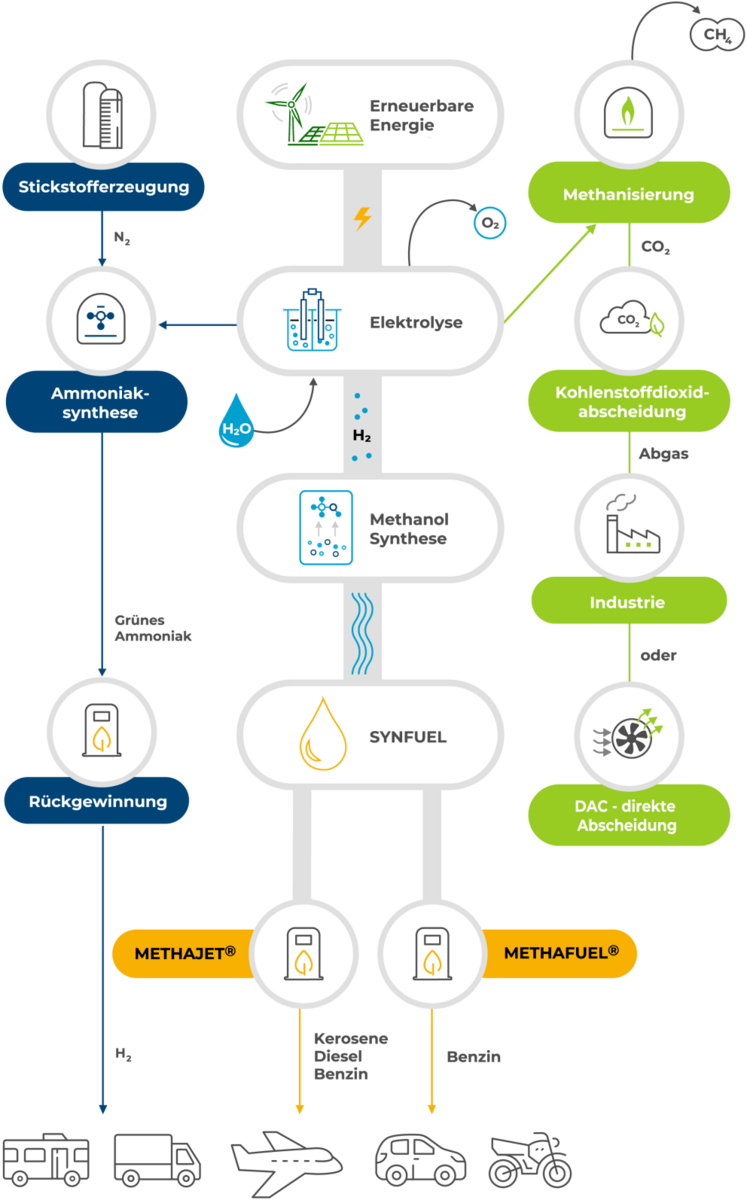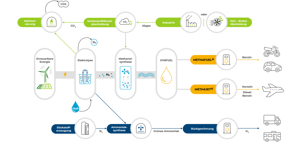 Seit 2008 beschäftigen wir uns erfolgreich mit der Entwicklung und Umsetzung eigener Technologien für klimaneutrale Kraftstoffe auf Basis von Methanol. Der Vorteil liegt in der kostengünstigen Herstellung von Methanol in energiebegünstigten Regionen, dem Transport über vorhandene Handels-Infrastruktur und der Umwandlung in E-Fuels zu wettbewerbsfähigen Kosten. Dies trägt sofort zur Senkung fossiler CO2-Emissionen bei.
